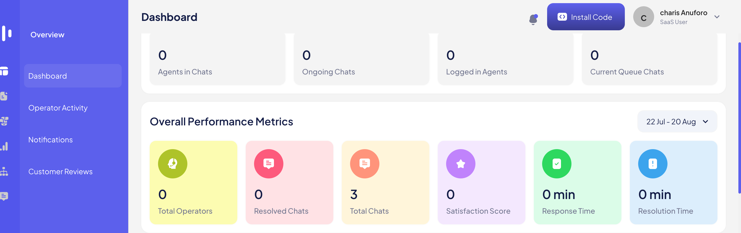 Our NowChat dashboard provides a real-time overview of your team's performance. These metrics help you monitor chat activity, team responsiveness, and customer satisfaction.