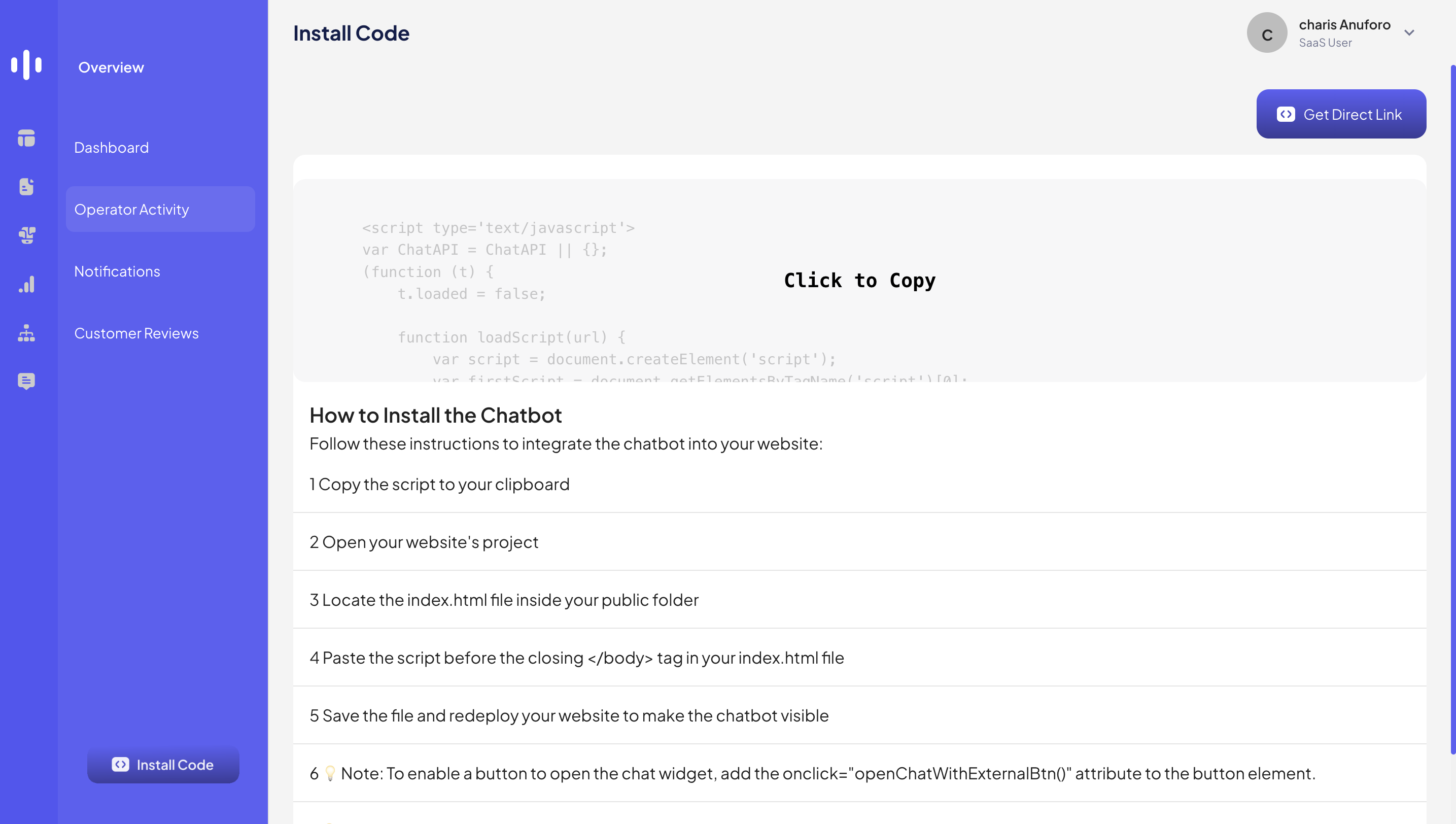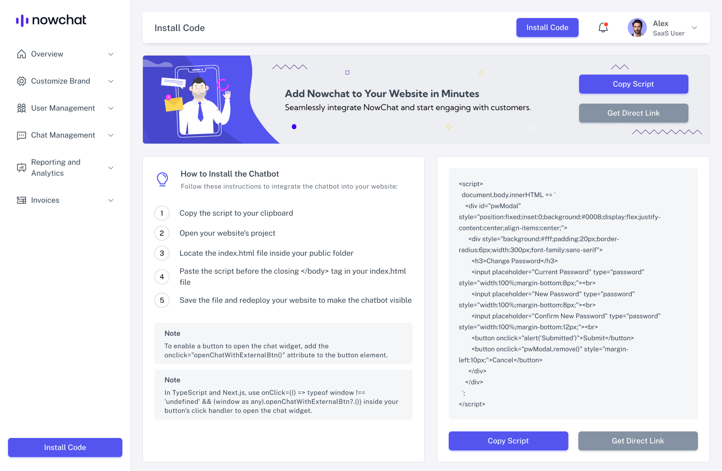To enable real-time customer conversations, you’ll need to embed the NowChat widget on your website. This is done by installing a small JavaScript snippet.