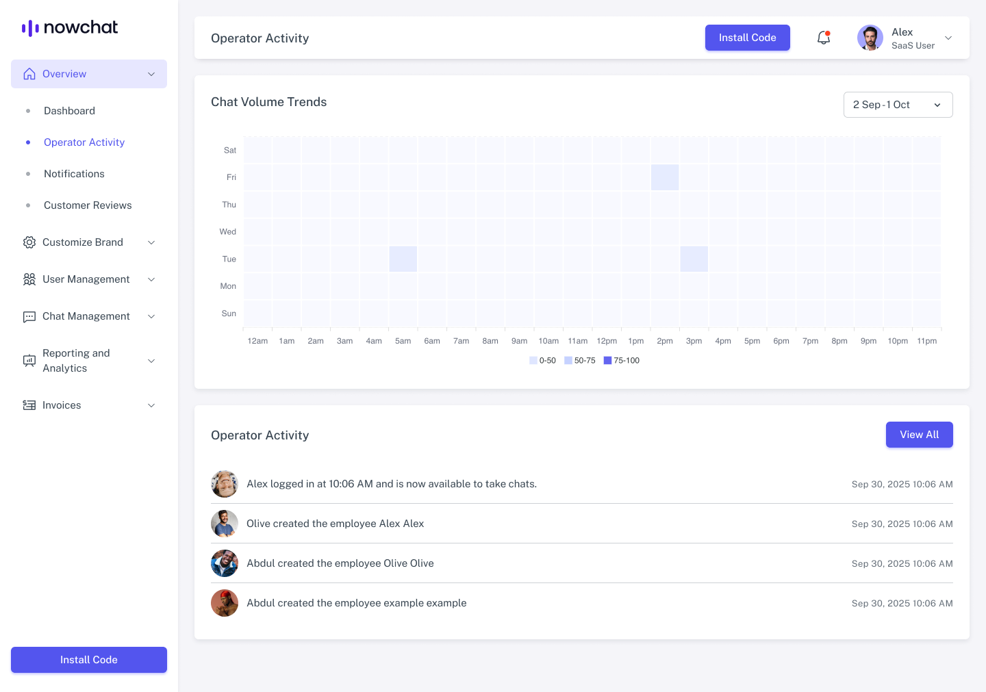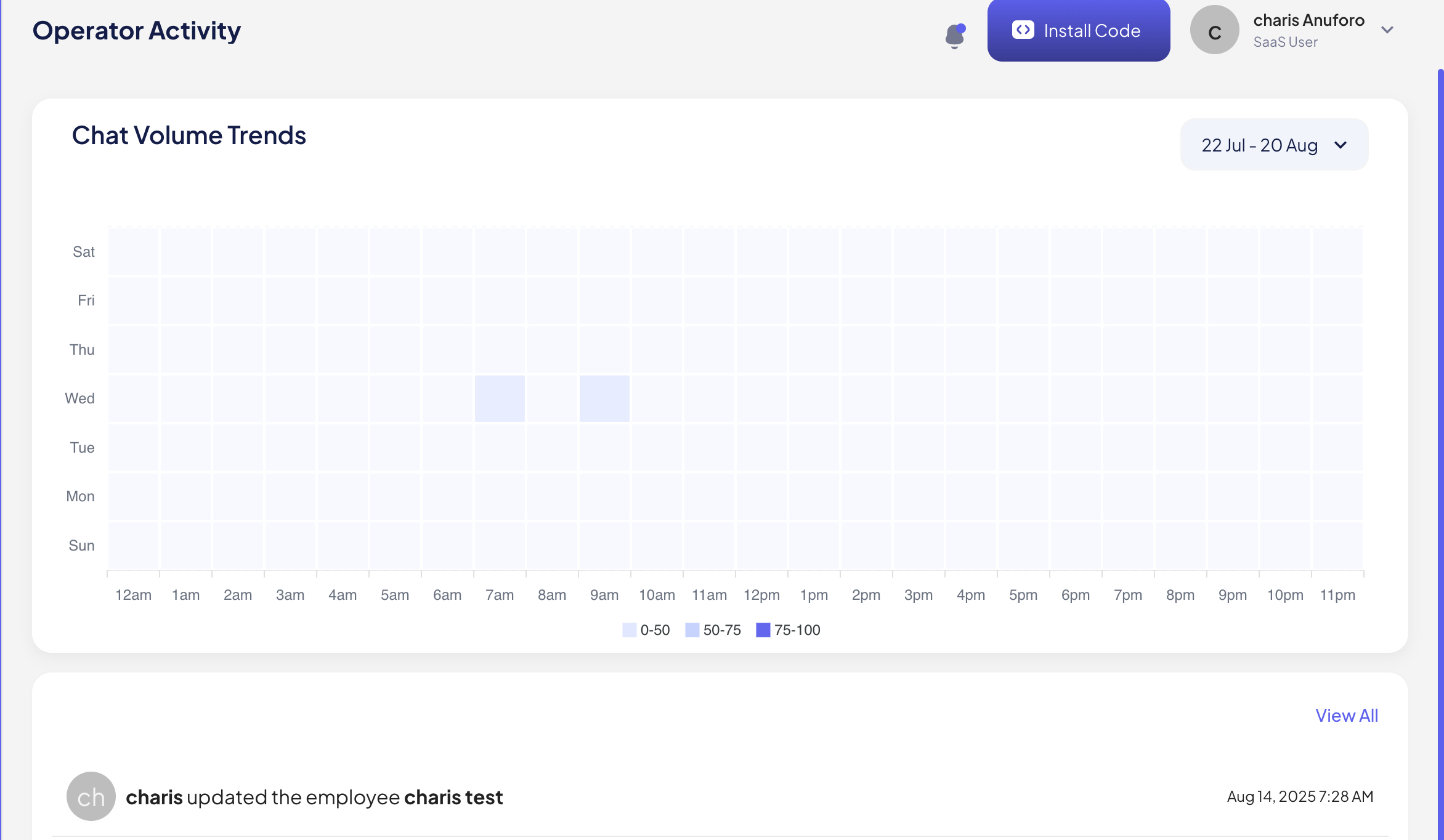 The Operator Activity panel helps supervisors and brand admins monitor team performance in real time. It offers visibility into chat volume trends and activity logs.