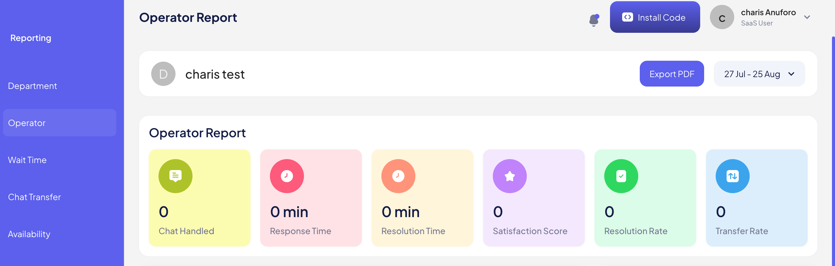 Operator reports allow you to assess individual team member performance , helping you identify top performers, coaching opportunities, and trends in chat quality.